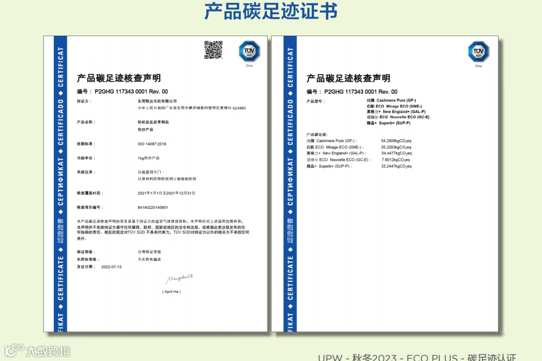 英格兰+系列则在此基础上环保革新,注入UPW品牌“时尚可持续”核心理念的ECO因子,在2022年获得由核查机构TÜV南德颁布的碳足迹认证及碳足迹标签。