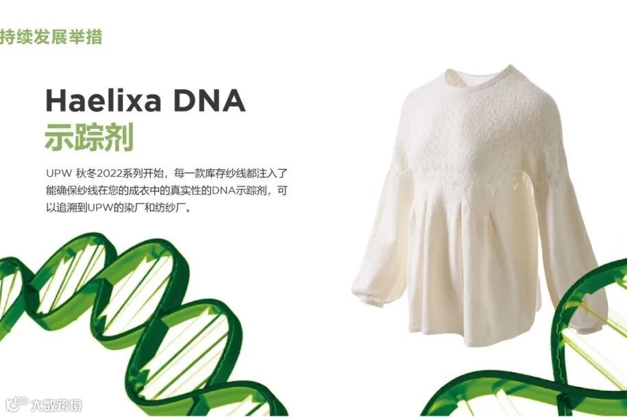从UPW秋冬2022系列开始,每一款库存纱线都注入真实的DNA示踪剂,让纱线可以从源头开始追溯,让可持续更加透明化。为纱线赋予防伪标识的ID身份,为品牌提供科技前沿力量支持。
