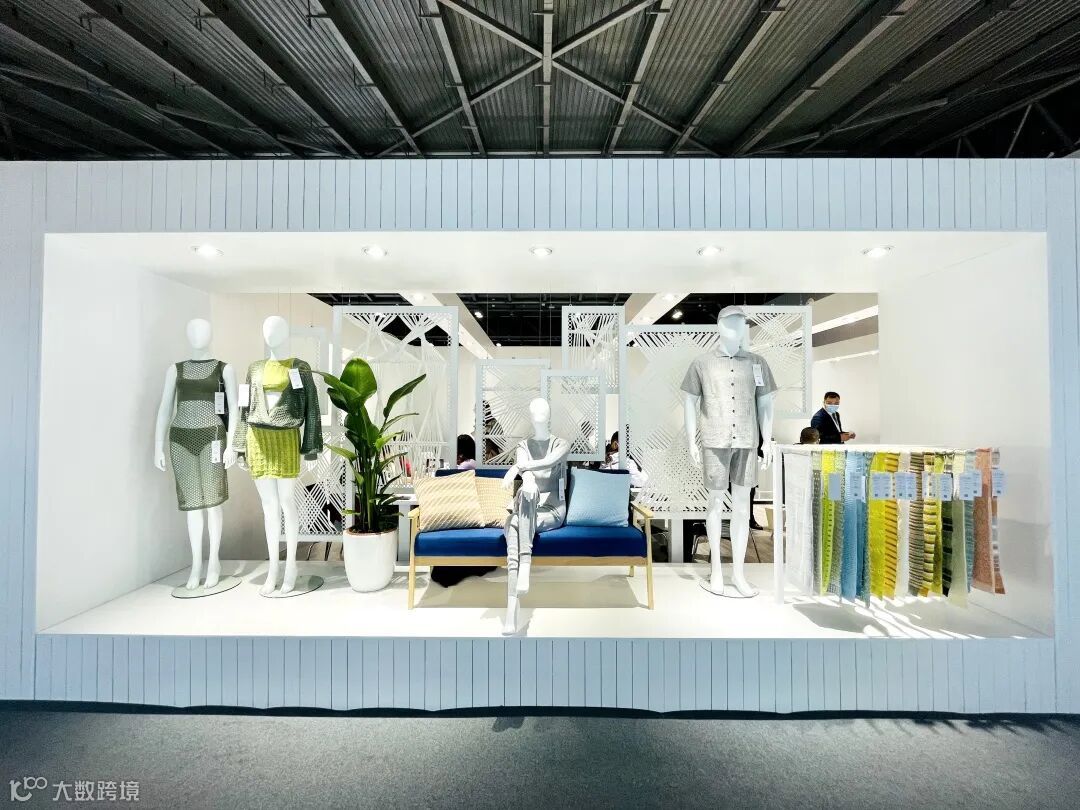 主展区的三大橱窗集中展示2022春季系列纱线产品,以及根据潮流趋势及纱线特点所设计的时尚男女成衣。