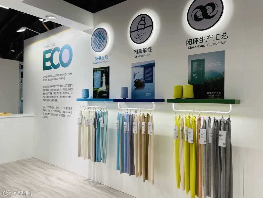 U-LAB展区则主要围绕2022春季ECO系列,展示了环保涤纶、可降解性、闭环生产工艺、有机农业、染料认证五大系列的故事理念。