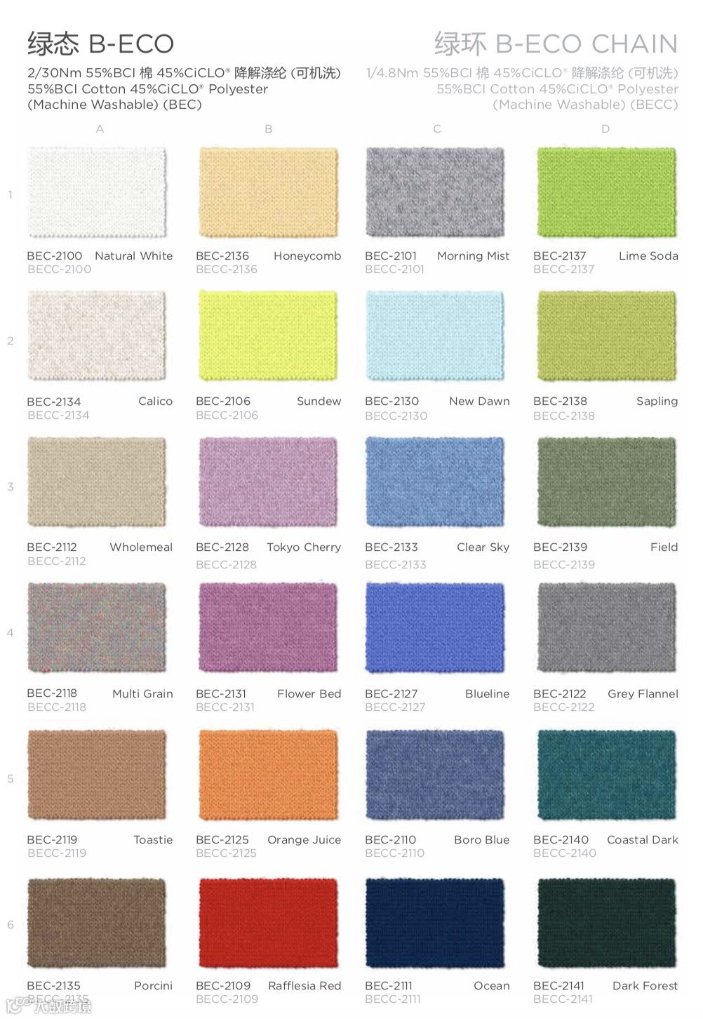 绿态B-ECO与绿环B-ECO CHAIN两款纱线,以55%BCI棉与45%CiCLO®降解涤纶混纺制成,其外观和手感上与天然纤维羊毛相似。但相较羊毛不易打理的特性,B-ECO系列可机洗、耐用性强,且抗起球和芯吸性能俱佳的特点,更能满足夏季衣物高频清洗的诉求。