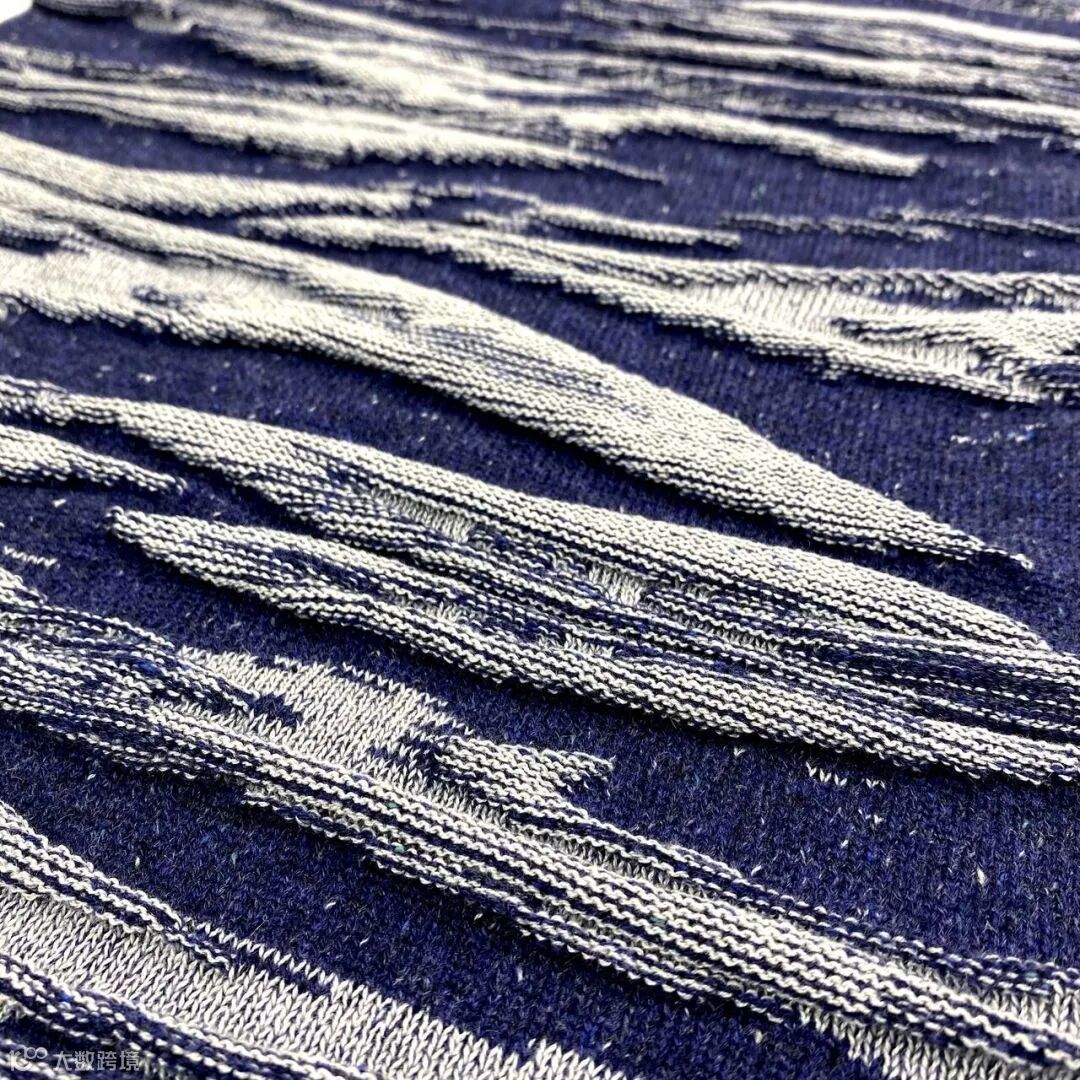 南极洲主题布片选择冷色调的冰川蓝为主色调,将白色纱线处理出不规则的立体褶皱,从视觉上营造冰川融化后,地表逐渐露出的样貌。