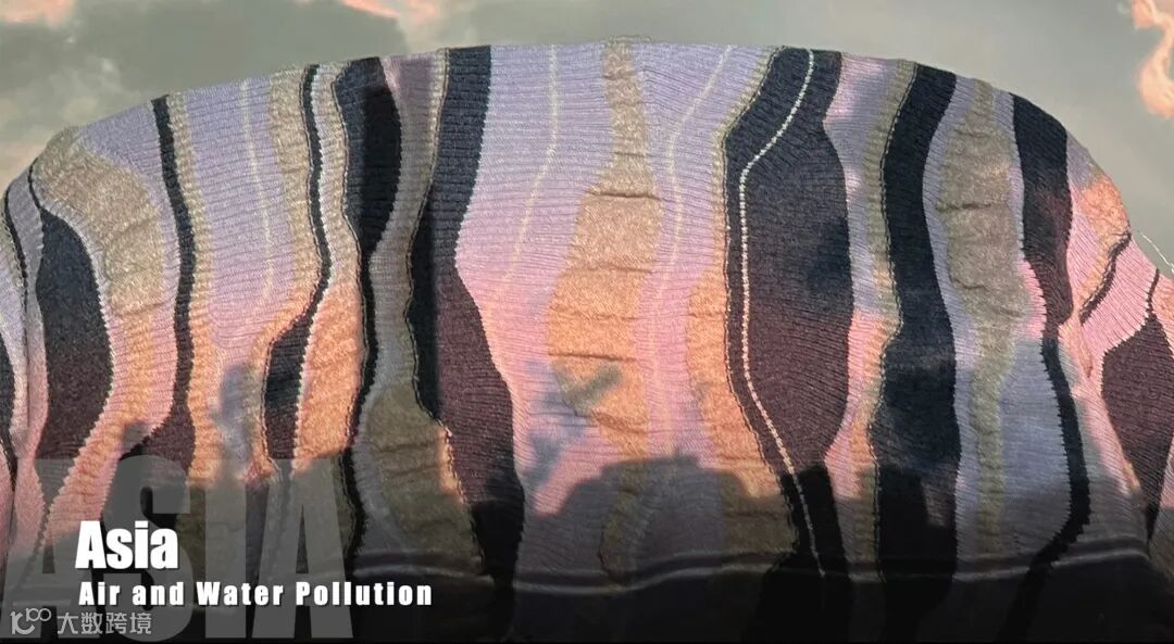 亚洲主题布片中,使用到了淡紫、黑蓝与灰色,以不同粗细比例的间或错落交织加以不同密度的褶皱,平铺开来,就带有地表的风、沙、水在遭受污染后仍不断流动、不断扩大的画面感。