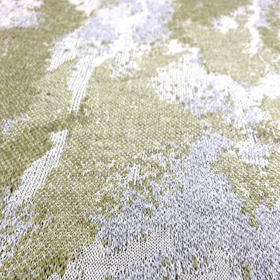 南美洲主题布片以低饱和的灰绿色调和灰紫色调,以芝麻点提花等工艺手法的做旧处理,为布片在丰富的图案色彩变化中营造出立体与平面的过渡,呈现了鸟瞰森林遭受砍伐后露出树干与地面的秃棱、斑驳。