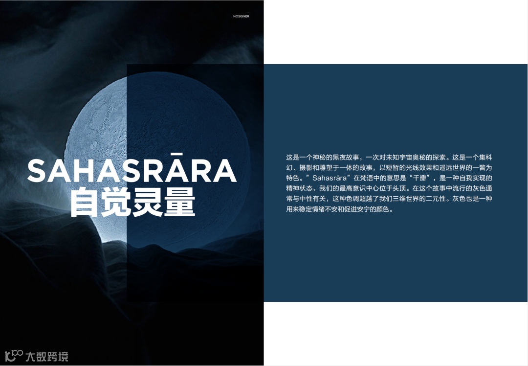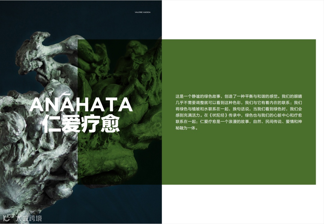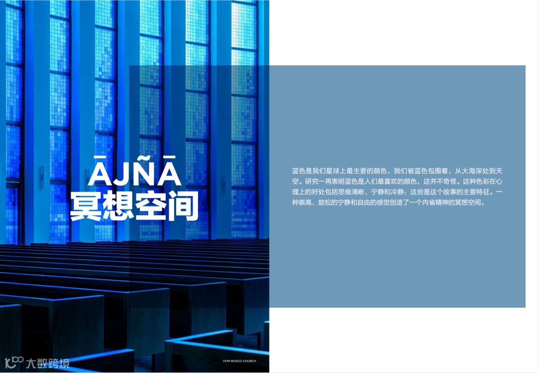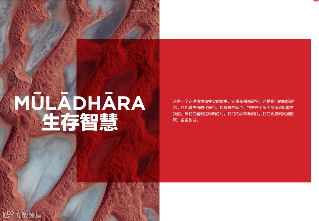 生存智慧(MŪLĀDHĀRA)是一个充满热情和朴实的红色故事,重在强调欲望,这是我们的原始需求;跃动灵性(MANIPŪRA)带着刺激性的黄将我们的情绪和彼此联系在一起,引领我们趋向光明;仁爱疗愈(ANĀHATA)缔造了一个静谧的绿色空间,沉浸此中,我们能够感受到平衡与和谐;冥想空间(ĀJÑĀ)是一个内省世界,蓝色凭借独特宁静、自由的感觉成为我们最喜欢的颜色;自觉灵量(SAHASRĀRA)是一个神秘的黑夜故事,是对未知宇宙奥秘的探索,这种灰调超越了三维世界的二元性。