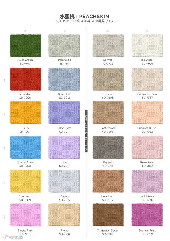 2023春季新水蜜桃ECO系列纱线,则是此前原版本的基础上更为生态友好的选择,经由丝、有机棉和CiCLO®降解再生尼龙混纺而成。多种环保纤维的加入,使得纱线整体面貌再次升级,手感也更加细腻有质感。另外,新水蜜桃ECO系列需特别定制。
