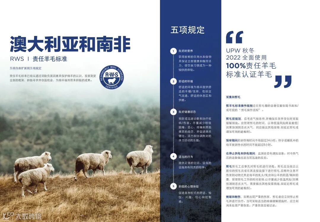 关注动物福利,建立可持续的羊毛生产方式,UPW秋冬2022责任羊毛系列以RWS责任羊毛标准为核心,全面使用来自世界各地的100%责任羊毛(标准认证羊毛),责任羊毛标准包括:动物福利,土地管理,环境保护,以及企业的社会责任。