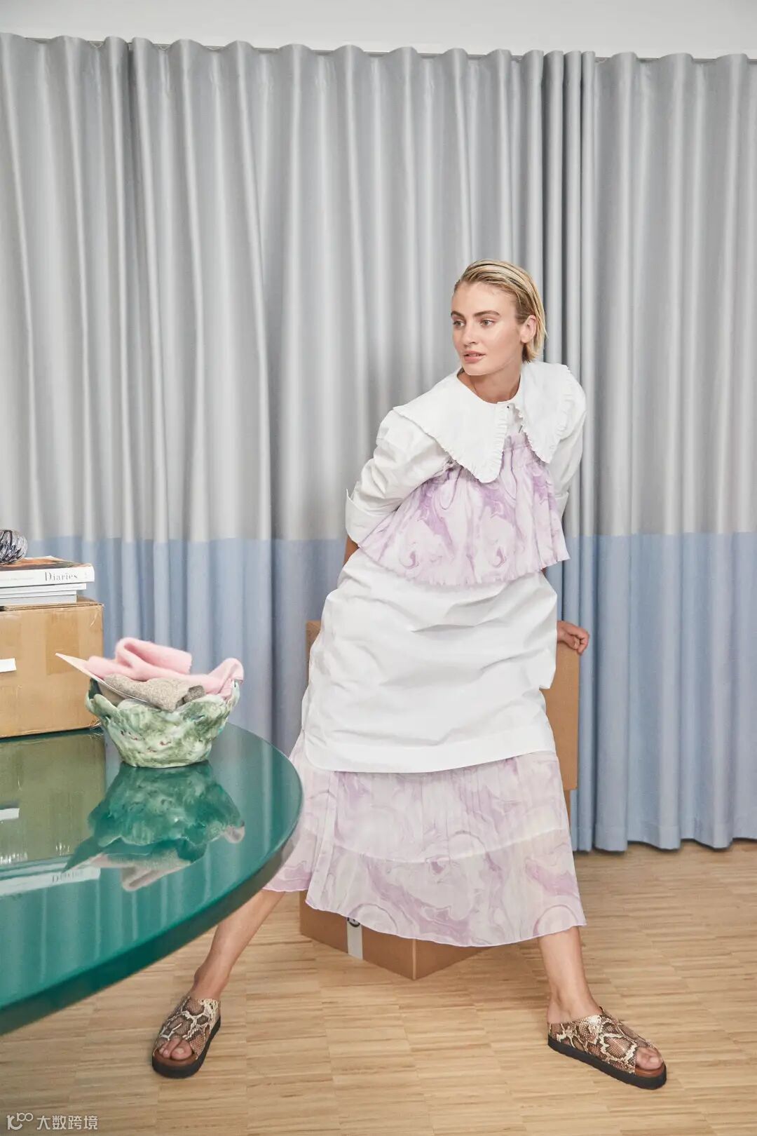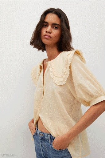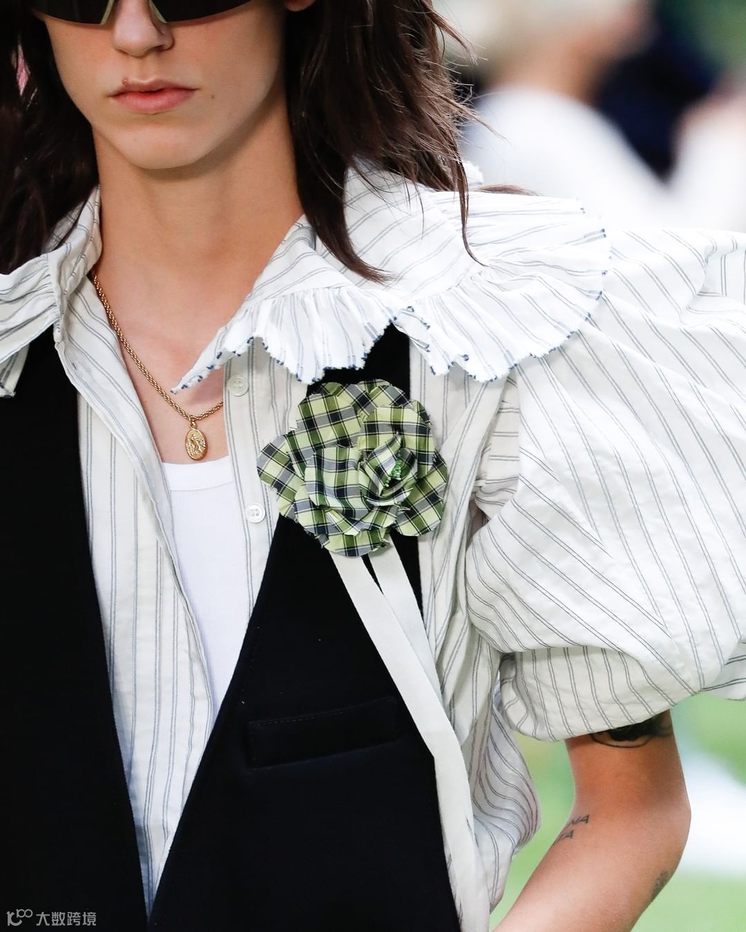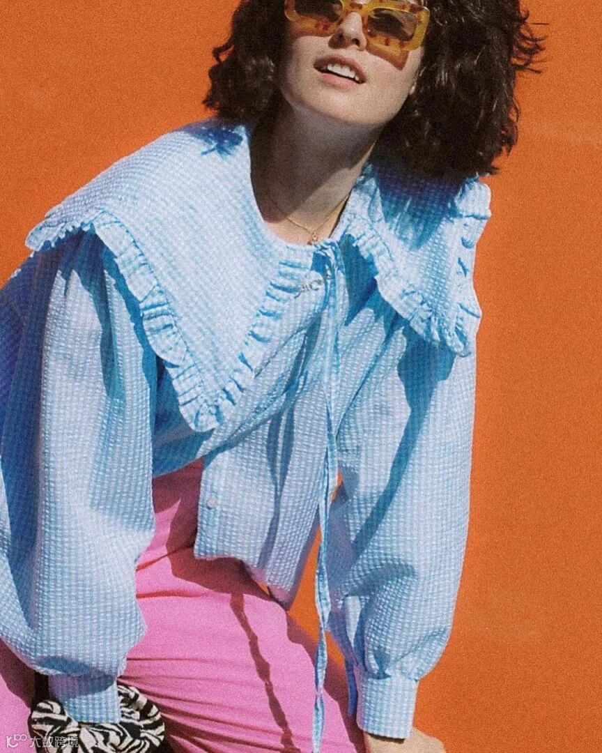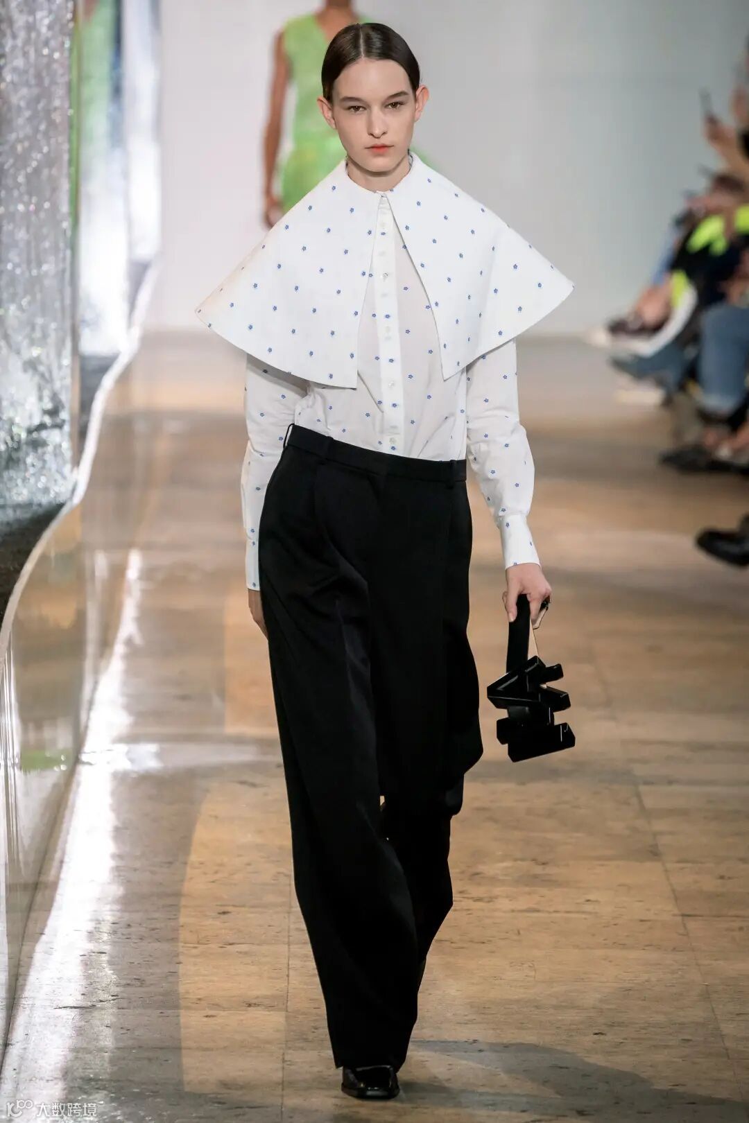 从领口设计上来看,去年大火的娃娃领在今年已经发展为各种形状的大翻领,更显头小脸小、头身比也变得更好。当大面积的翻领成为整件衬衫的视觉主体,自然也就为设计的心思留足了发挥空间,能轻松制造视线落点、记忆点,甚至社交话题点,堪称凹造型与开启social模式的穿着利器。