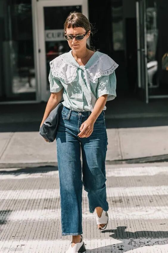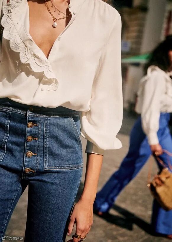 衬衫的王牌CP当然要属丹宁牛仔了,经典水洗的直筒牛仔裤或喇叭牛仔裤,皆是法式衬衫的绝搭。当丹宁的休闲狂放属性与衬衫的精致文艺发生化学反应,既能中和掉牛仔的不羁,也能适度弱化掉大翻领带来的甜腻感,想咸想甜尽在尺度拿捏之间。