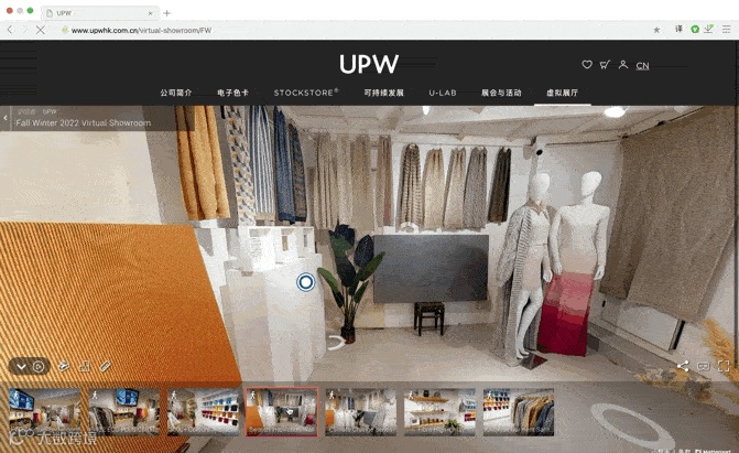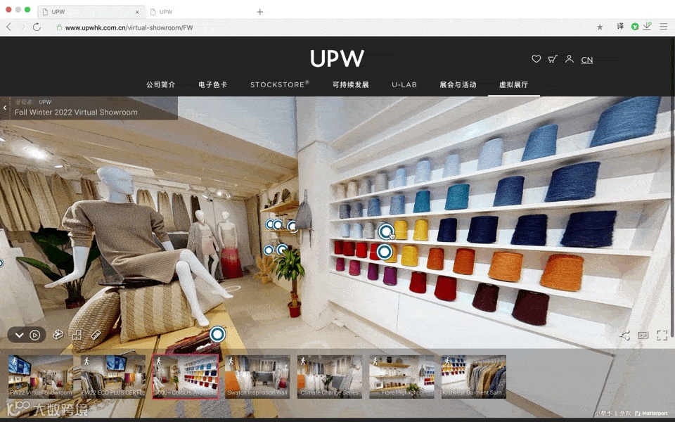 进入UPW的Virtual Showroom虚拟展厅,映入眼帘的是360度开放的全景,即时即刻浏览布片灵感墙、色卡、可持续环保纤维、气候变化系列、ECO 升级系列以及针织服装样品等与纱线有关的一切前瞻讯息。