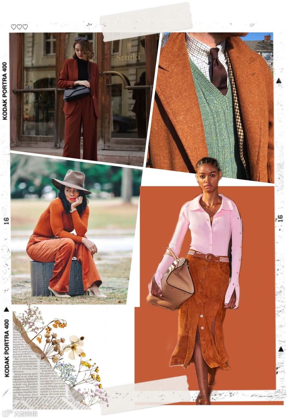 锈褐色是属于秋天、秋叶、土地的颜色,其浓郁度及成熟度高于金盏花橘,有高级沉稳的质感。锈褐色是一种乐观而强烈、刚毅又低调的时髦色彩,更是秋冬季既能点亮职场穿搭,又不会过分抢眼的视觉存在。
