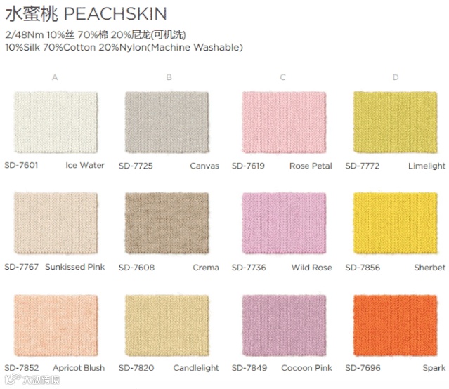 充满少女活力的水蜜桃,有着跳动的青春气息,历来都是春季最受欢迎的纱线之一。它不仅有着细腻柔滑度与流畅垂坠感,色卡颜色更极为丰富,可供设计者灵活挑选。