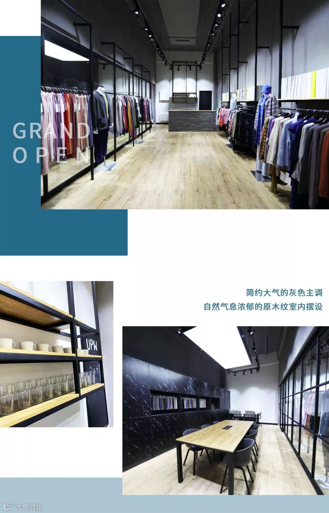 这是一家格调十足、时尚潮流的深度体验馆。店铺设计以简约大气的灰调为主,搭配充满自然气息的原木纹室内摆设。整洁广阔的空间和轻柔舒缓的色调不仅凸显出衣物的多姿多彩,而且也给用户带来雅致从容、轻松舒适的氛围感受,完美诠释了UPW的设计理念。而这样美好的店铺,所带来的美妙体验并不局限于此,接下来,UPW带你全方位解读TA的魅力所在~~
