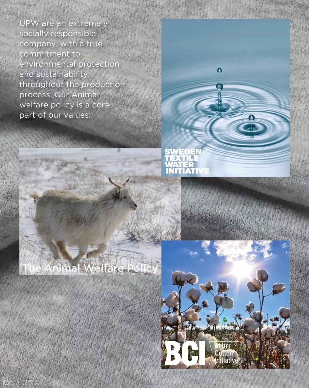UPW不采购任何被虐待动物的纤维,也不会因为生产需要而虐杀任何动物,所有动物纤维都是通过自然脱落或负责任的剪切获取的。所有的羊绒纤维都可追溯回内蒙古的四大羊绒产区,并确保从纤维至成衣的全程信息透明化。同时还通过了4项国际标准的专业认证,Oeko-Tex标准、GRS全球回收标准、GOTS全球有机纺织品标准、OCS有机含量标准。