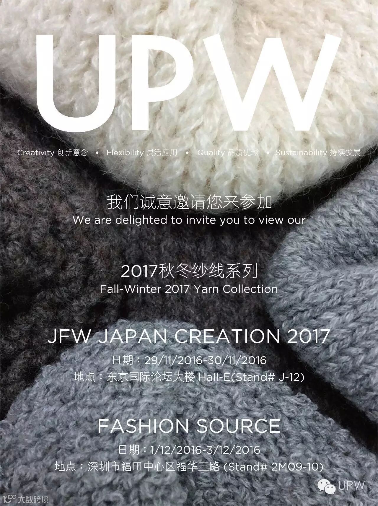 UPW即将于本月末(即11月末)在日本迎来2017年秋冬系列纱线展JFW JAPAN CREATION 2017,紧随着FASHION SOURCE于12月初在深圳会展中心开展。在这最后的两场线展中,新知旧友可以向我们的同事咨询并了解2017年秋冬系列纱线和最新流行趋势。