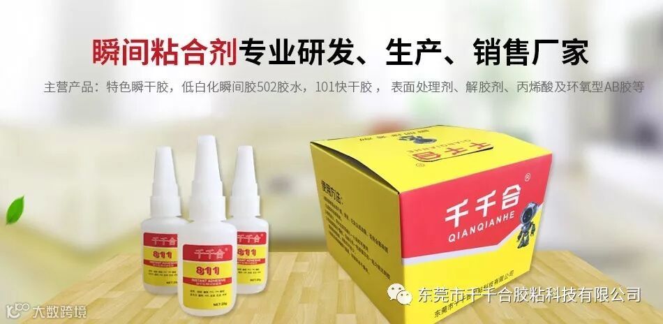 东莞市千千合胶粘科技有限公司是一家专门研发、生产、销售胶粘剂的综合性企业,并具有多年的历史.。 主要研发生产氰基丙烯酸酯粘合剂(瞬间粘合剂),拥有先进的生产设备和精湛的生产工艺,整套设备均采用电脑控制,设有专门的质检机构,严把质量关。在国内有广泛的知名度。 千千合公司经营研发产品:特色瞬干胶, 低白化瞬间胶502胶水,101快干胶 , 表面处理剂、解胶剂、丙烯酸及环氧型AB胶等,公司现有品牌 “千千合、百合缘 、 BAIHERE ”三个商标,深受广大用户的喜爱,公司不断的研制开发更加优质的产品、更加卓越的服务满足客户不断增长的高品位、高标准需求。 千千合胶业本着"诚信务实,精益求精"的一贯宗旨,公司上下同心同德,,勇于创新,不断开拓国际国内市场,愿和新老客户携手共进,共创辉煌!