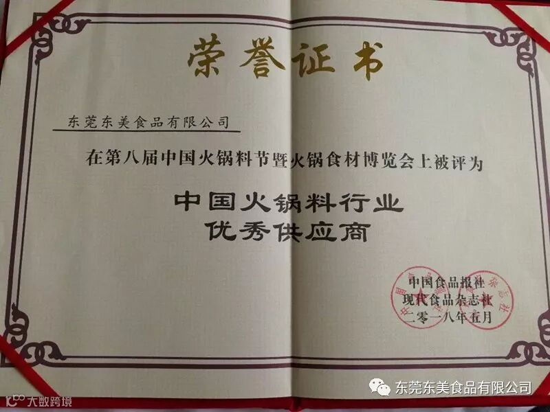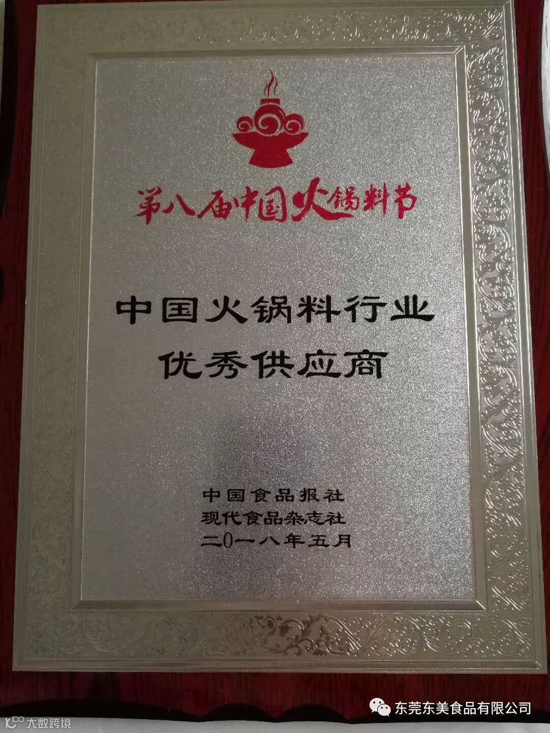 2018年5月18日-5月20日,东美公司参加“第八届中国火锅料节暨火锅食材博览会”,荣获“中国火锅料行业优秀供应商”荣誉证书。