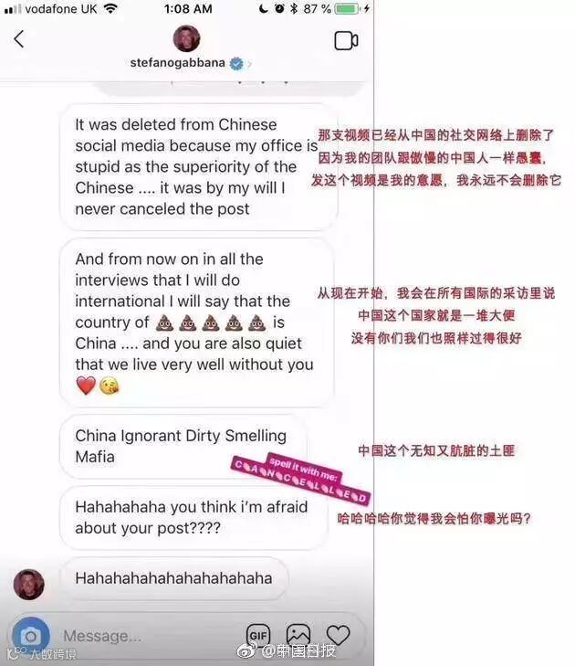 随后有网友在社交媒体上说起这件事,引起杜嘉班纳创始人之一、设计师Stefano Gabbana的社交媒体账号与网友争辩。这位设计师在和网友争辩过程中,恼羞成怒、大骂出口,还公然辱华,并称不怕被曝光。
