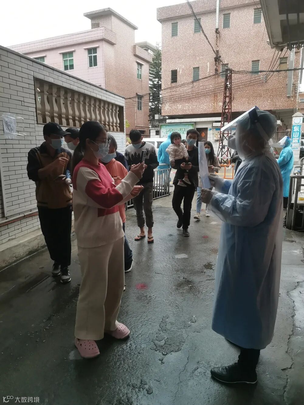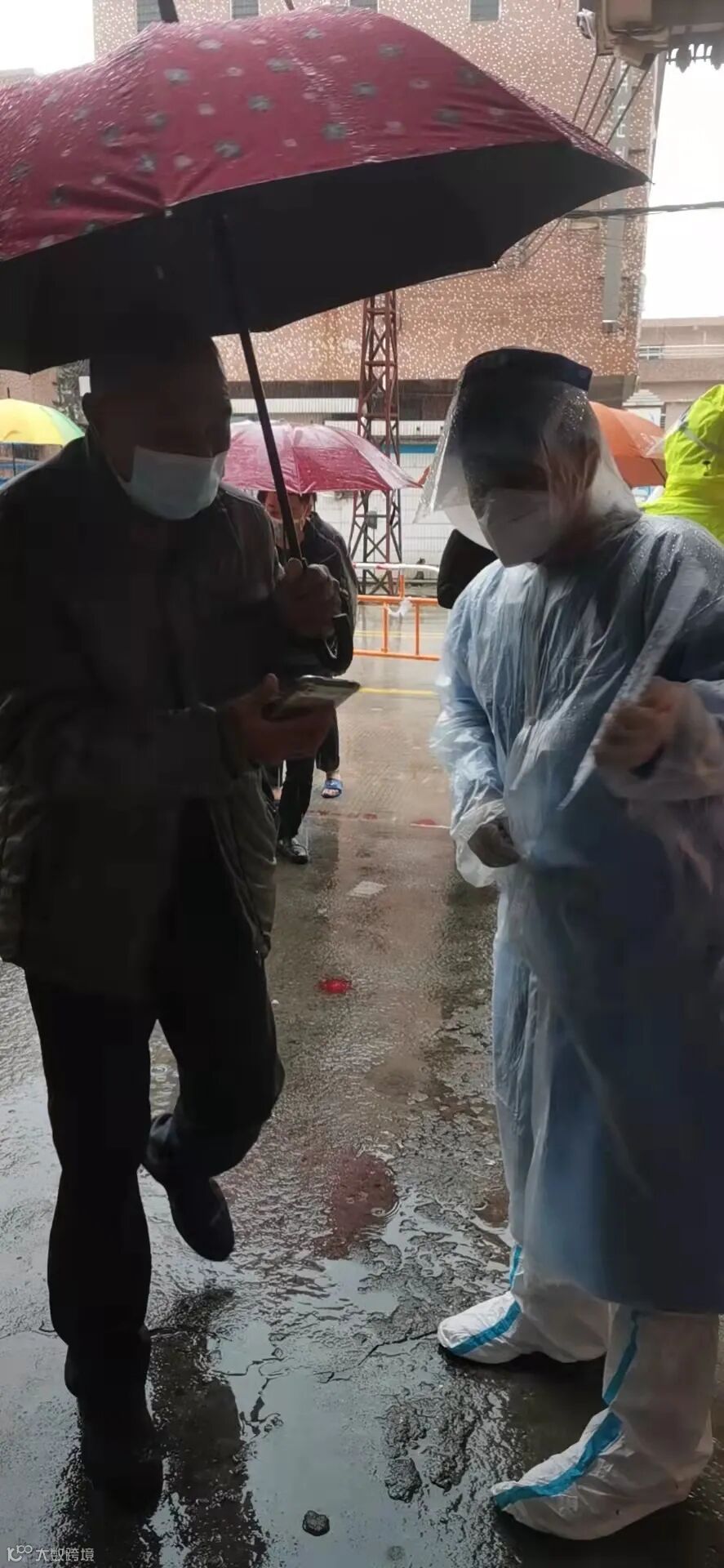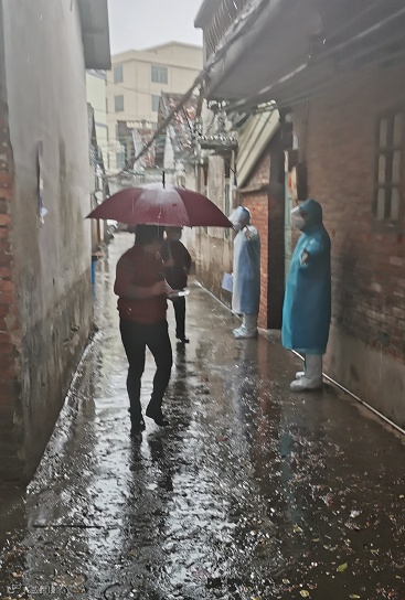 大雨一直下虽未停过,但志愿者们的热情不减,他们分工明确各司其职,将人流分配地井然有序,让整个过程变得流畅而完整,保障核酸检测能井然有序地进行。