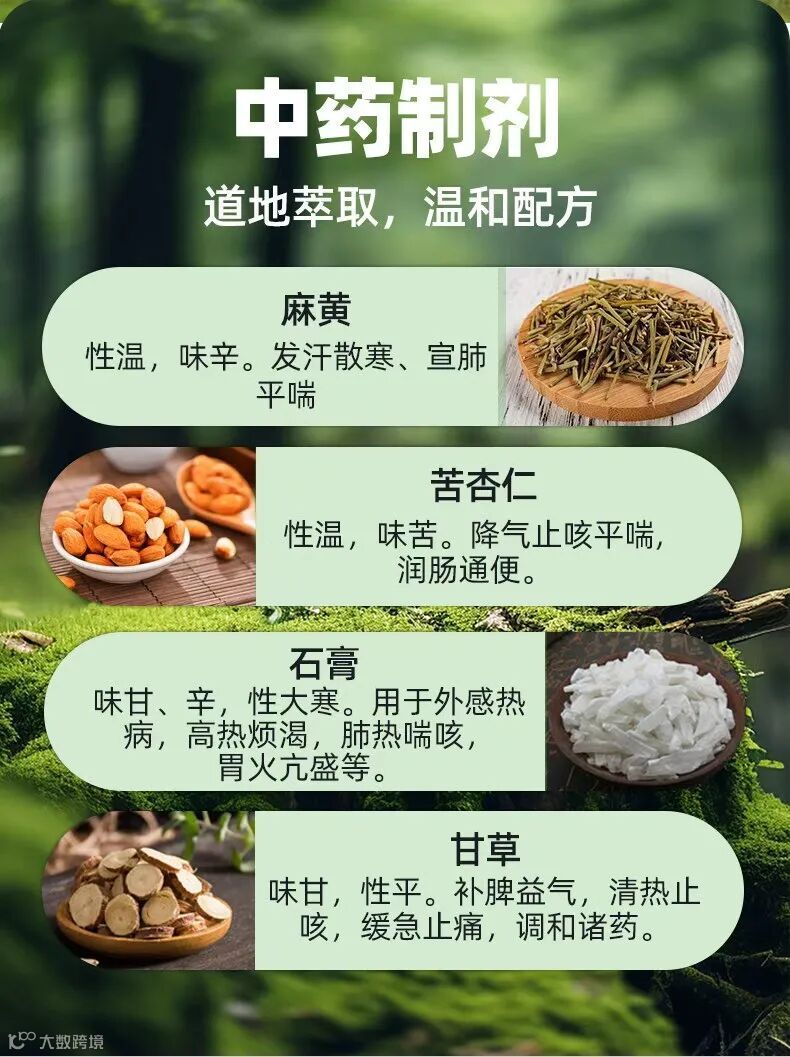 主要成分:麻黄、苦杏仁、石膏、甘草