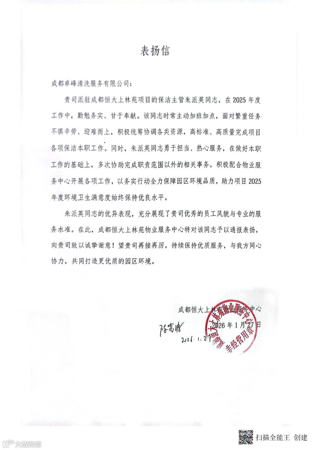 其优异表现充分展现了我司优秀的员工风貌与专业服务水准,成都恒大上林苑物业服务中心特出具表扬信予以通报表扬。