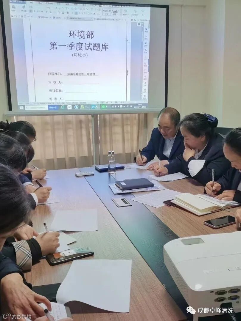 公司日保部门经理、主管在品质部的主持下开展第一季度的品质考试,试卷涵盖日常保洁作业规范、药剂使用、日常作业方法、工具使用等内容。