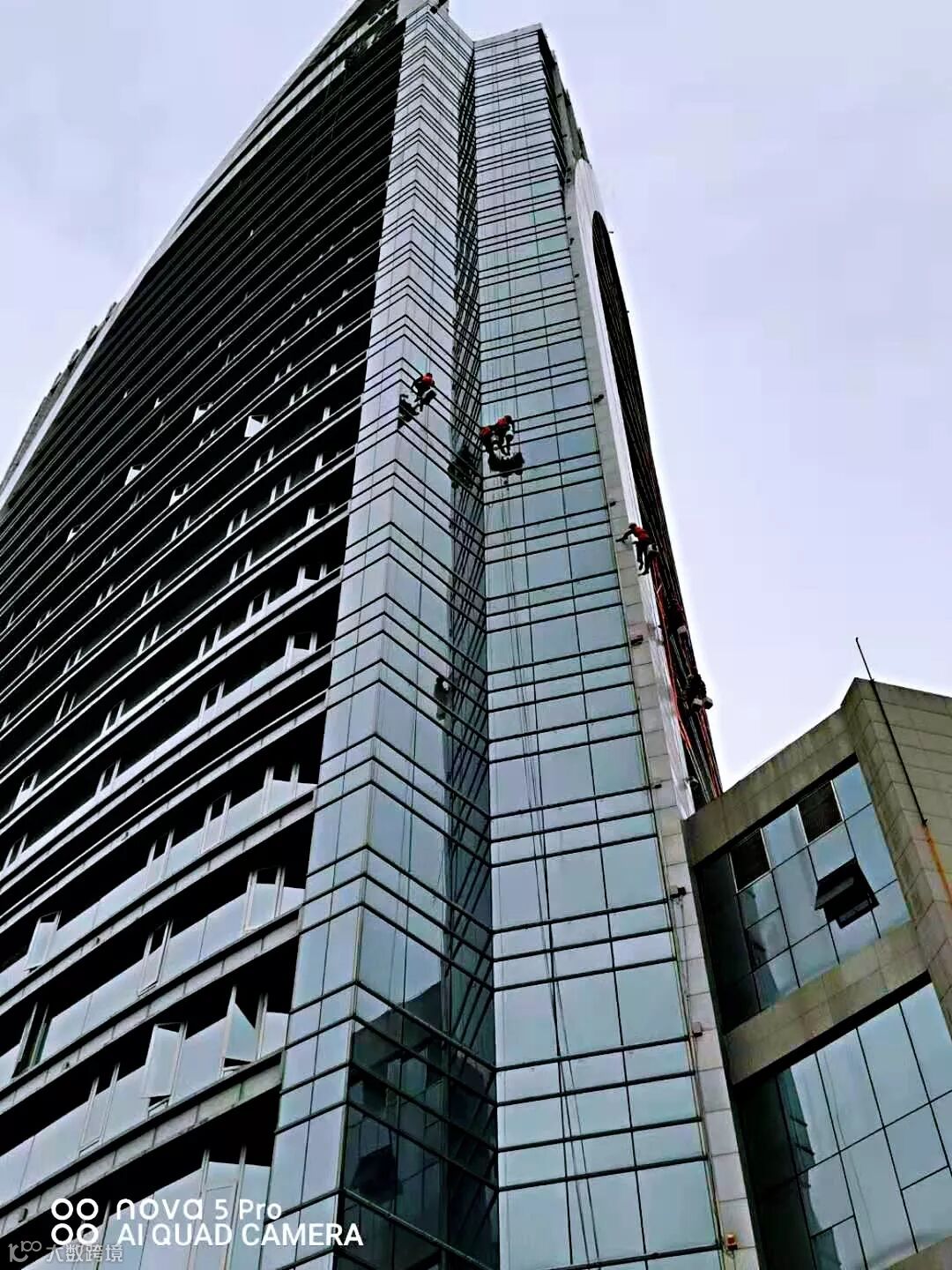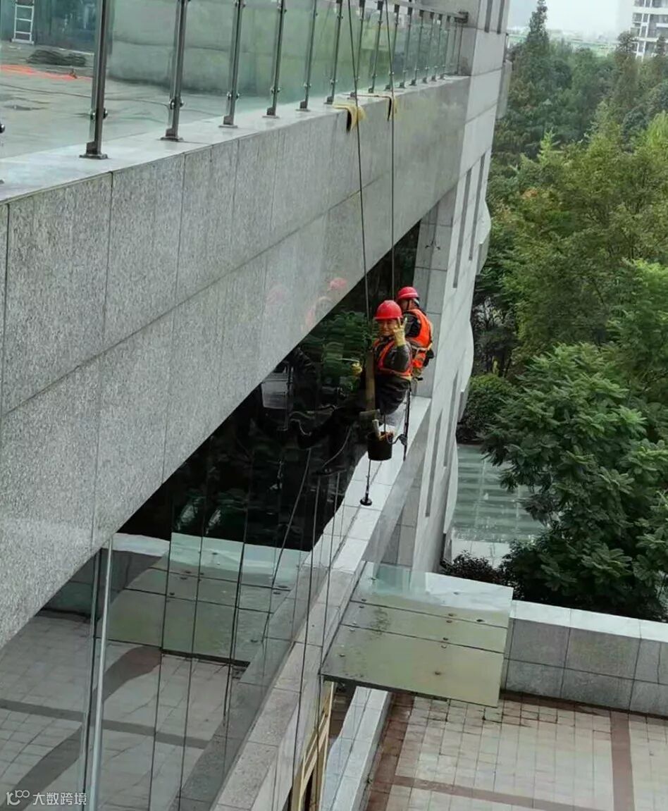5.再确认一次应作业范围(一般宽度为1.5米左右)的墙面已清洗完毕,滑动吊篮或吊板,继续往下作业,直到地面,再整理工具,添加清洗剂,再上屋顶开始第二趟作业。