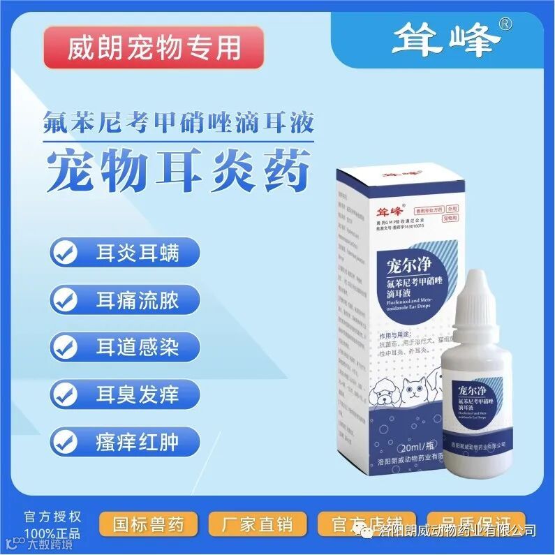 最后给大家带来一款朗威药业耸峰系列明星产品之一的氟苯尼考甲硝锉滴耳液。专为宠物耳部问题研制。可有效解决治疗各种宠物耳部疾病。