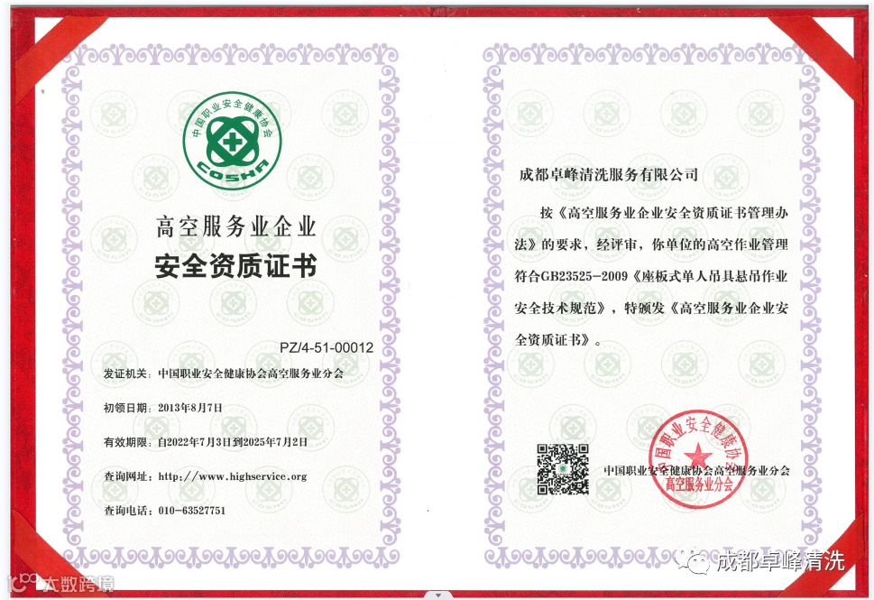 我司拥有一批长期从事专业外墙清洗的作业人员,可同时最多8个项目作业开展,并且我司作业操作人员均通过高空作业资格考试,取得特种作业操作证书,持证上岗率达100%;且我司超过五年从业经验的高中类作业人员超80%,平均清洗的外墙累积超过两百多个项目,在项目实操方面拥有丰富的经验和专业的技术。