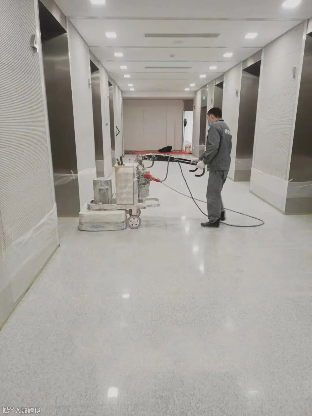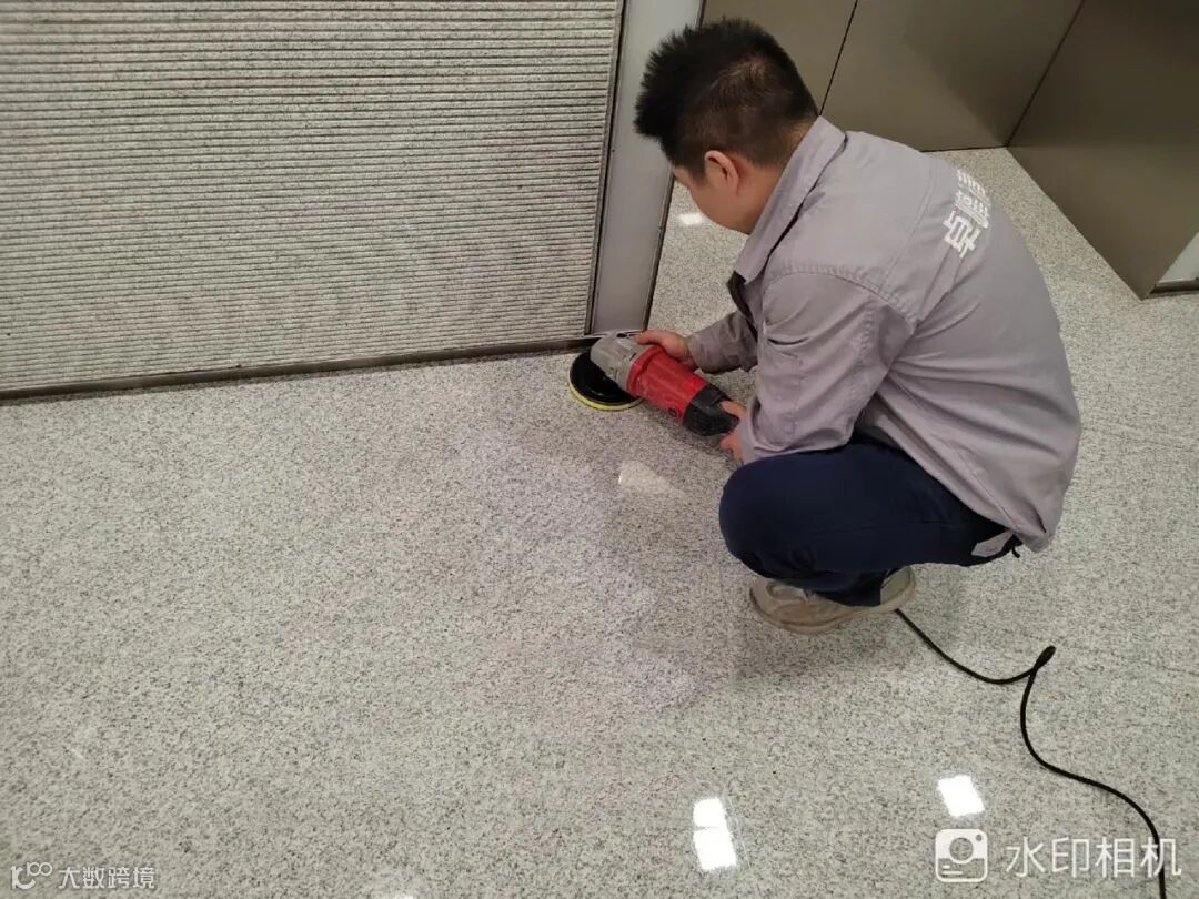 为了让石材焕然一新,石材工人需要用大型设备清理石材表面及缝隙的污垢,让其重现自然的色泽和光亮,用精密的机械对踢脚、边缘缝隙处进行精细地打磨。