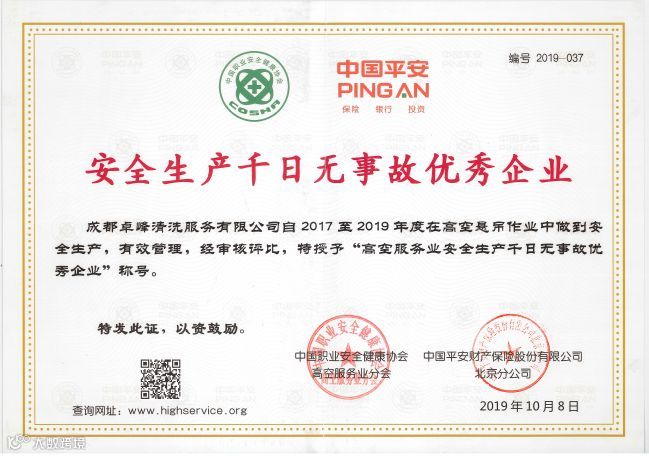 11月7日,为加强高空服务业的安全管理,保障行业健康发展,表彰先进,树立行业安全模范,为市场提供安全作业的高空服务先进企业。在北京举办的高空服务业“安全生产千日无事故优秀企业”评选活动中,经高空分会评审组按评审条件审查,分会委员会审核决定,对我司成都卓峰清洗予以“安全生产千日无事故优秀企业”的表彰,并授予了证书。