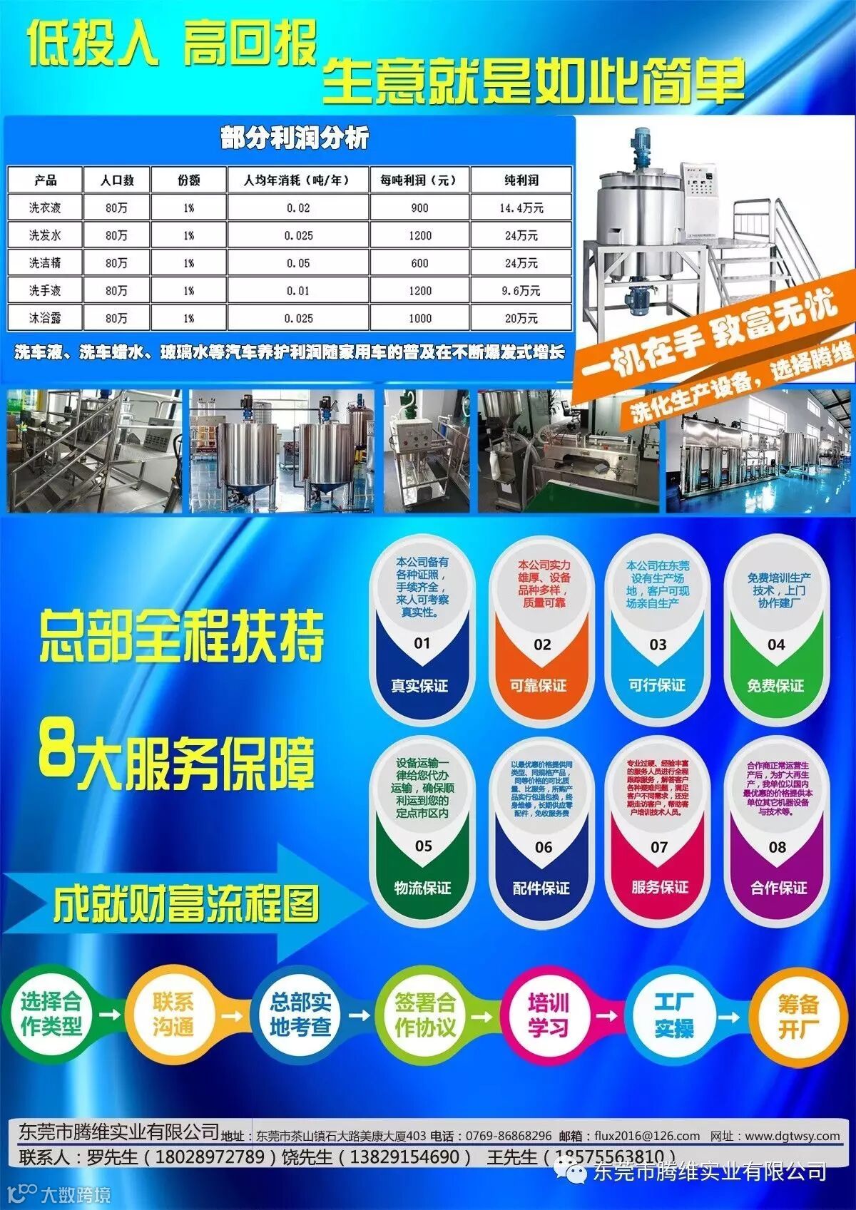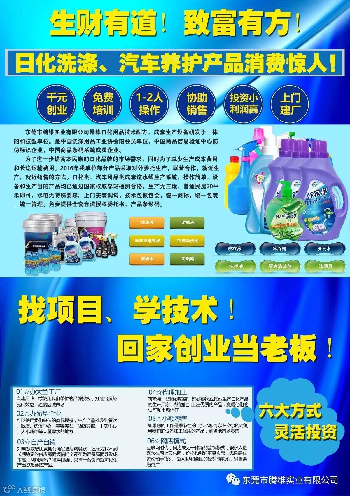 和长途运输费用。2016年我单位部分产品采取对外委托生产,联营合作,就近生产,就近销售的方式。日化类,汽车用品类成套流水线生产系统,操作简单,设备和生产出的产品均已通过国家权威总站检测合格,生产无三废,普通民房30平米即可,水电无特殊要求。上门安装调试,技术包教包会,统一商标,统一包装,统一管理。免费提供全套合法授权委托书,产品条形码。