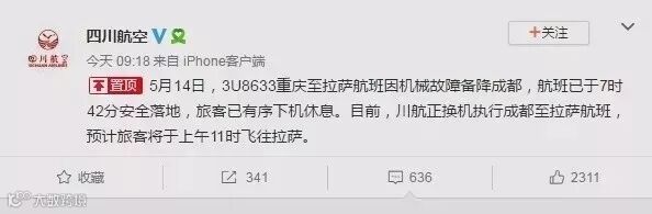 5月14日早上9点多,四川航空(下称“川航”)官方微博发布通报称,由川航执飞的3U8633重庆至拉萨航班因机械故障备降成都,航班已于7时42分安全落地,旅客已有序下机休息。