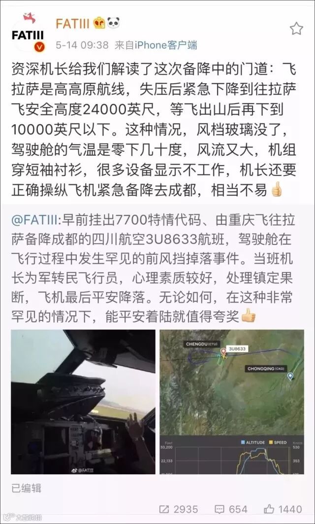 很多飞行界资深人士表示,这个过程相当惊险、应对非常不易,堪称“世界级”。这么大的高空事故,对飞行员的生理和心理都是严峻考验。应对成功,说明机长的心理素质非常过硬。从无线电录音中听上去,(机长)比较淡定,处理过程镇定果断。