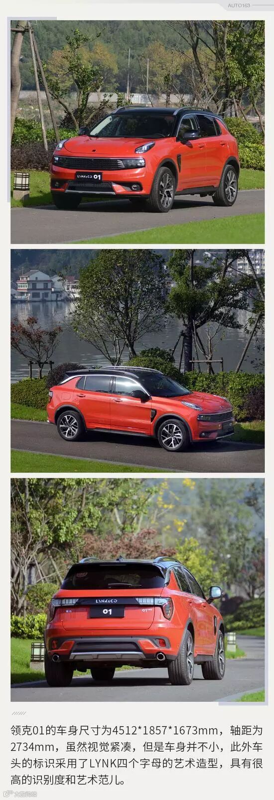 领克01在外观上没有发现明显的模仿痕迹,也许这对于国产品牌来说是一个不小的进步,在外形上定位于都市个性的年轻群体,外形尺寸为长4512mm*宽1857*高1673,轴距上也达到了同级别中较长的2734mm轴距,分体式大灯和LED光源的使用让整车看起开很有设计感,据悉该车上市后会提供多种个性颜色搭配供消费者选择。