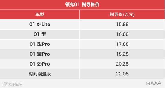 新车共推出6款车型,分别为“纯Lite、型、型Pro、耀Pro以及劲Pro”,此外还包括在广州车展亮相的时间限量版,全系搭载2.0T发动机, 售价区间为15.88-20.28万元,而广州车展预售的“时间限量版”车型(限量1001台/每月开放200台)售价也正式公布,为22.08万元。此外,领克将为消费者提供终身免费车辆质保、终身免费道路救援、终身免费WiFi数据流量服务。