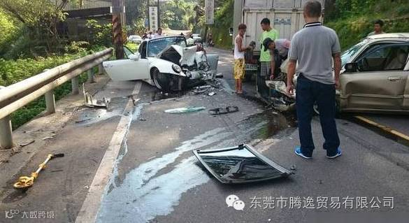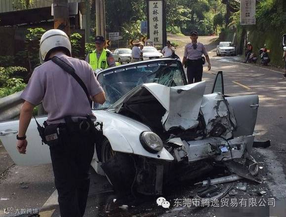 被撞的保时捷车主黄怡豪是知名牙医,在台北市忠孝东路4段开业,据了解,该辆保时捷是他多年前花150万元新台币(约合32万元人民币)购得。图为保时捷几乎全毁。