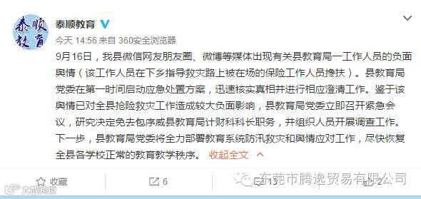 最新消息:泰顺县教育局官方微博“泰顺教育”9月16日下午3时许发布消息,对该局计财科科长“在下乡指导救灾路上被在场的保险工作人员搀扶”一事作出回应,决定免去包序威县教育局计财科科长职务。