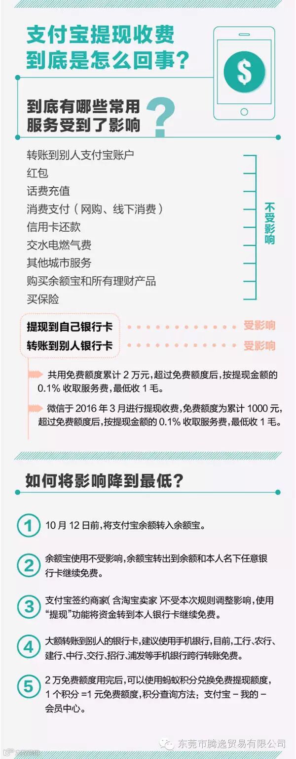 继微信3月开始收取提现手续费后,支付宝刚刚发布公告表示,因综合经营成本上升,自2016年10月12日起,支付宝将对个人用户超出免费额度的提现收取0.1%的服务费,个人用户每人累计享有2万元基础免费提现额度。在用完基础免费额度后,用户可以使用蚂蚁积分兑换更多免费提现额度。