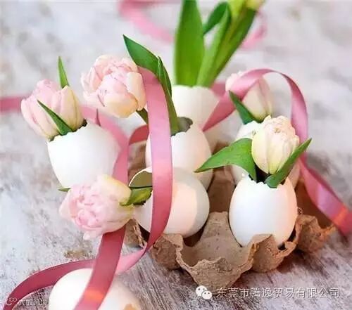 不要把蛋壳完全打破,然后你可以把买的小花剪一剪,插在蛋壳里边。