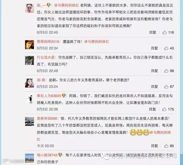 就在昨日,称自马蓉妈妈徐红的微博爆料的一段针对网民的评论,一下子把刚刚退去的宝马事件又重新拉升到一个新高。娱乐本身就是给人一种娱乐感 ,而自称为马蓉妈妈徐红却以国家教育的方式指责,实在是令人费解啊,关于王宝强与马蓉的丑事小编我也不做过多的评论了,大家都关注这么久了,都非常清楚了。看一下自称马蓉妈妈徐红的微博是怎么说的: