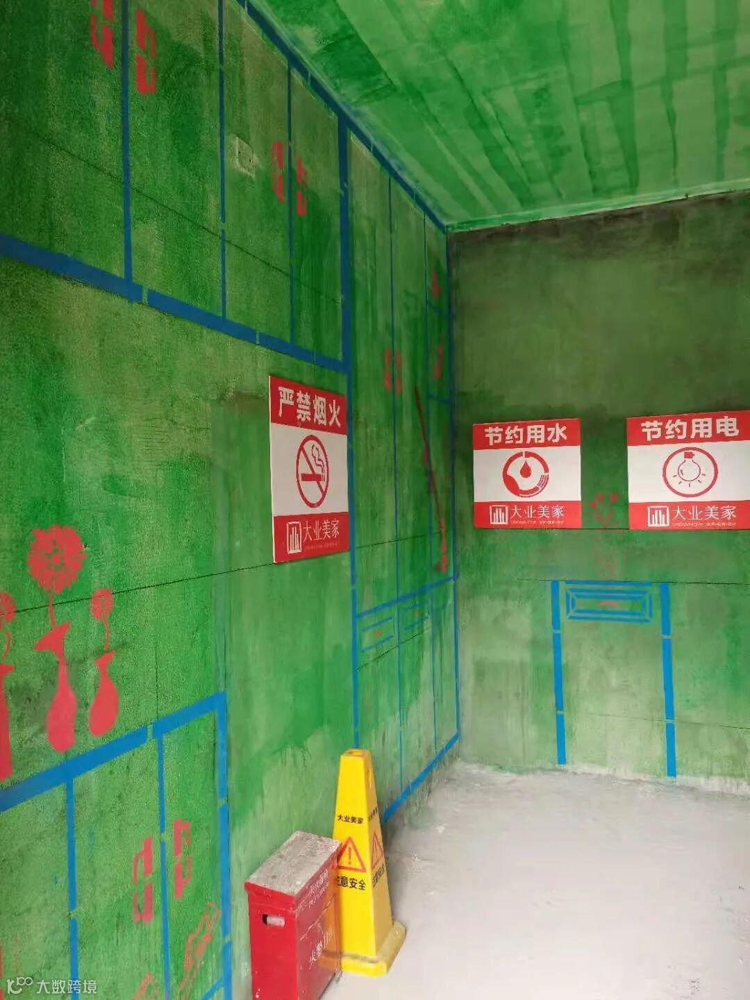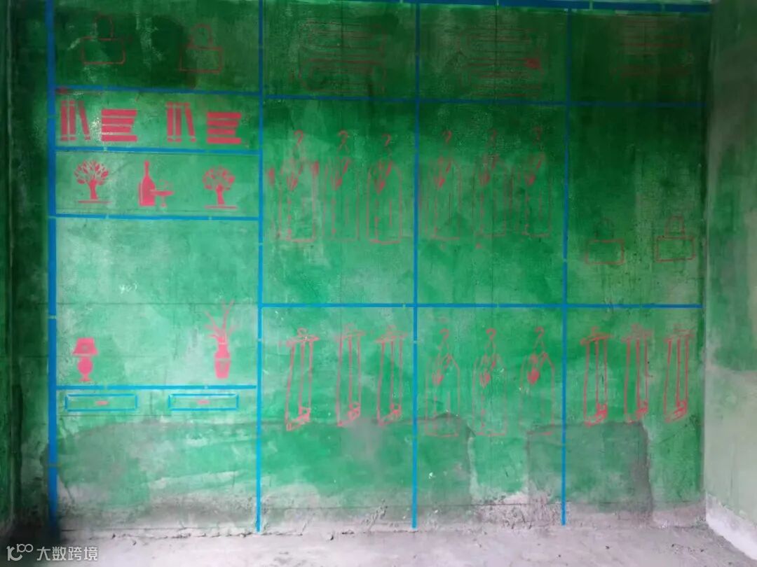 工地现场墙体砌制完成刷完墙固,现场做彩色一比一放样,避免设计图纸与现场不符。