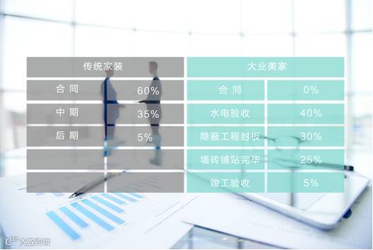 大业美家率先推出“先施工 后付款”、“分项验收 分项付款”的诚信家装商业模式,颠覆了传统家装20多年来的霸王付款方式。家装0首付,客户0风险,将装修的主动权转移到客户手中,从根本上保证了客户的利益。