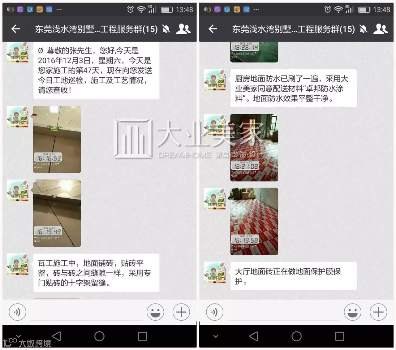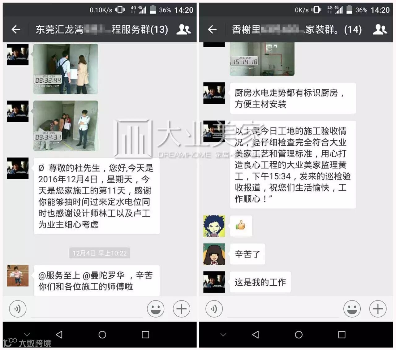 设计老师、客户管家到施工现场巡查的结果和发现的问题也会在群里反馈与解决,总经理每月至少一次工地巡查。