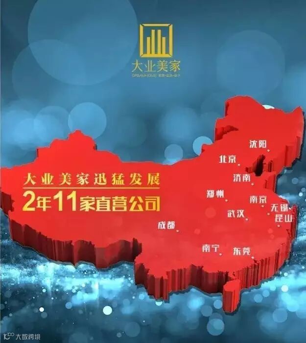 从2014年3月第一家公司成立至今,大业美家家居装饰势如破竹,成为目前拥有北京、南京、成都、武汉、济南、郑州、南宁、东莞、沈阳、昆山、无锡11家直营公司的国内知名家装品牌。不过才短短两年多,凭借新型工程管理模式与服务理念,大业美家以疾风迅雷之势在家装行业异军突起,成为家装界的神话!