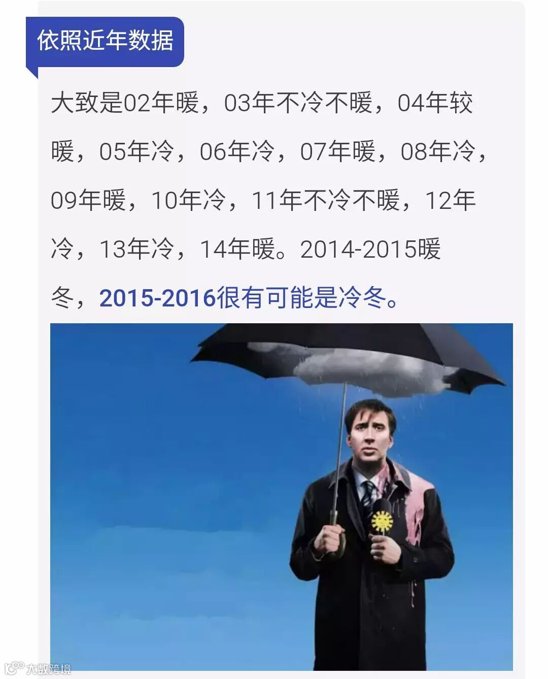 气象学家认为 “2015年冬天可能会好冻”:而且呢个冻,唔係一般既冻,由于今年发生咗1950年以来最强烈既厄尔尼诺现象,气象学家预测今年冬天将面临极端既严寒气候。