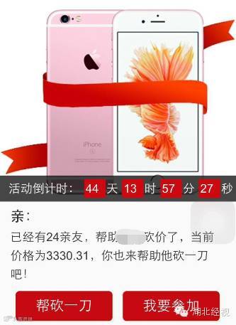最近,黄先生看到朋友圈的一个朋友发了一个链接。“链接里面写,只要找朋友帮忙砍价,最低0元就可以购买苹果6S的最新款手机。”黄先生当即点了进去,帮朋友点了一下“砍价”键,留下姓名和电话后,页面马上显示“你已帮朋友砍了79元”。