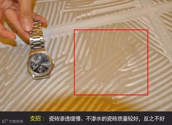 看瓷砖吸水率。一般来说,瓷砖的吸水率低,代表瓷砖的内在稳定性越高,也就越适合湿气或水分含量较高的空间,如卫生间、厨房等,且不会产生黑斑等问题。检验瓷砖吸水率的常用方法是将瓷砖的背面倒水,渗透缓慢甚至不渗水的瓷砖质量较好,反之则为不好。