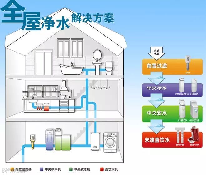 理想的状况应是一个家庭应该有一套完整的中央水处理系统。这不但能解决饮用水的问题,也能够去除生活用水中的挥发性有害物质对于人体的侵害。