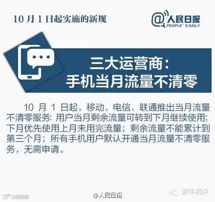 小编发现从10月起,将实施许多新政,很多都与各位的生活息息相关,特别是:移动、电信、联通将从10月1日开始推出当月流量不清零的举措。